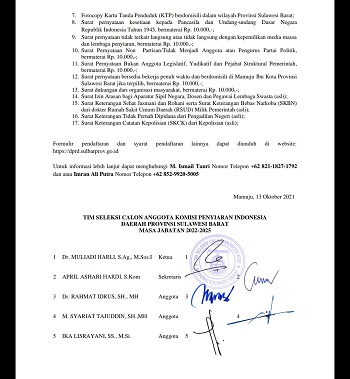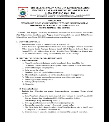 MAMUJU--Proses seleksi calon Komisioner Komisi Penyiaran Indonesia Daerah (KPID) Sulawesi Barat periode 2022-2025 resmi dimulai. Timsel calon Komisioner KPID Sulawesi Barat telah secara resmi membuka pendaftaran yang bakal bermula dari 14 Oktober 2021 hingga 4 November 2021.